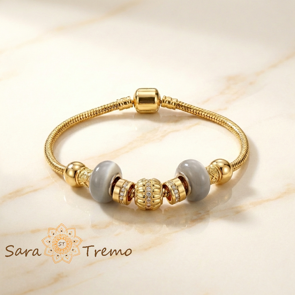 Bratara Eleganta Serena este dedicata femeii care iubeste rafinamentul discret. Nuantele gri sidefate ale charms-urilor centrale aduc echilibru si calm, in timp ce elementele aurii creeaza un contrast elegant si sofisticat. Este o bijuterie cu prezenta linistita, dar puternica, perfecta pentru tinute clasice sau moderne.