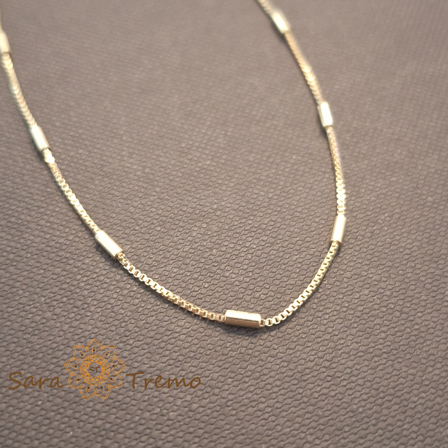 Modelul său este alcătuit dintr-un lanț fin, îmbogățit cu inserții cilindrice aurii, distribuite simetric, pentru un efect vizual armonios și modern. Textura netedă și luciul perfect o fac potrivită atât pentru ținute casual, cât și pentru cele rafinate.