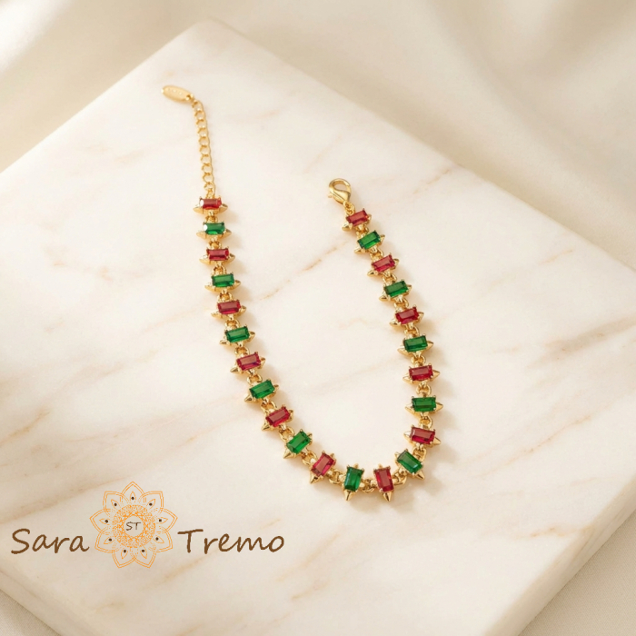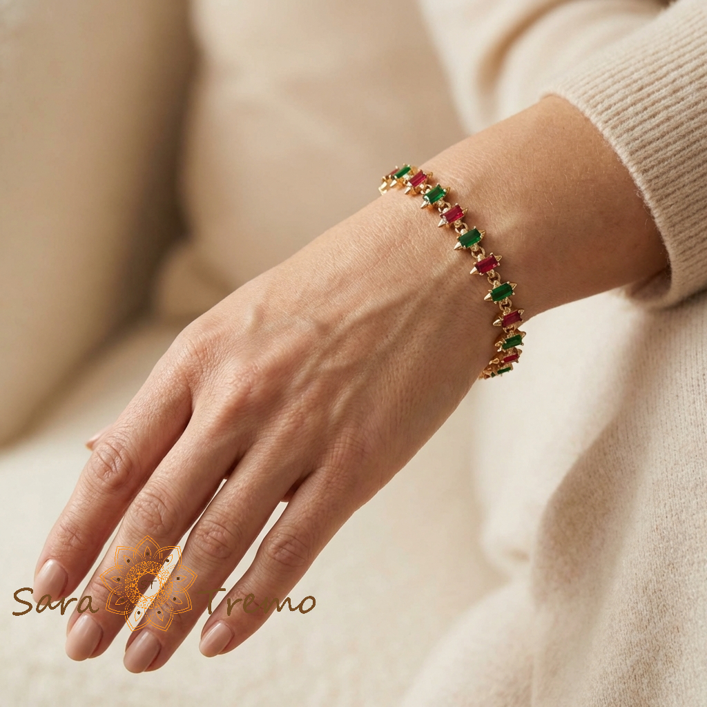 Cristalele rosii si verzi imita perfect rubinul si smaraldul natural, oferind un efect vizual luxos, similar bijuteriilor fine din aur masiv. Este o alegere ideala pentru evenimente speciale, sarbatori sau pentru momentele in care vrei sa porti ceva diferit, dar cu gust. O bratara cu personalitate, pentru o femeie care stie ca eleganta sta in detalii.