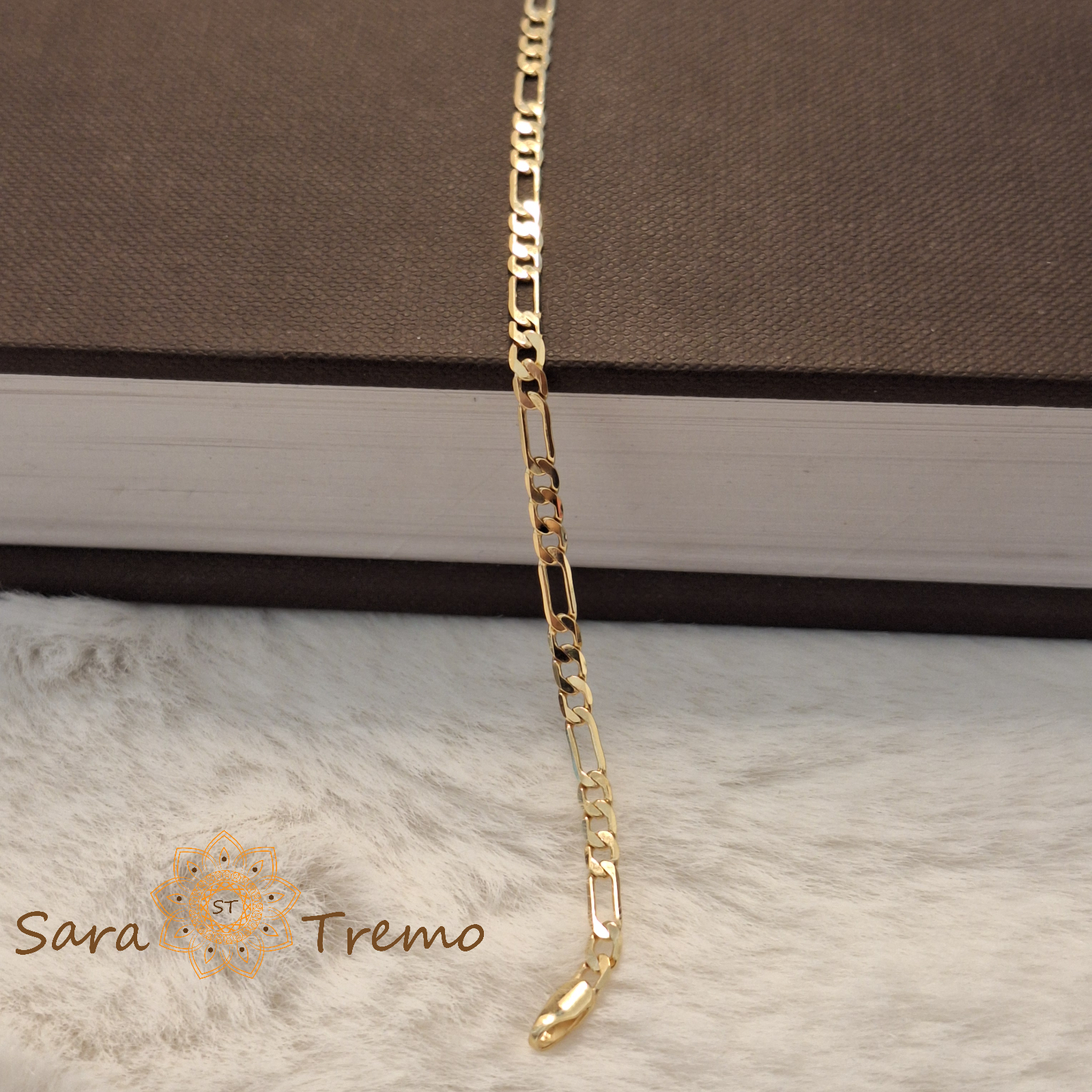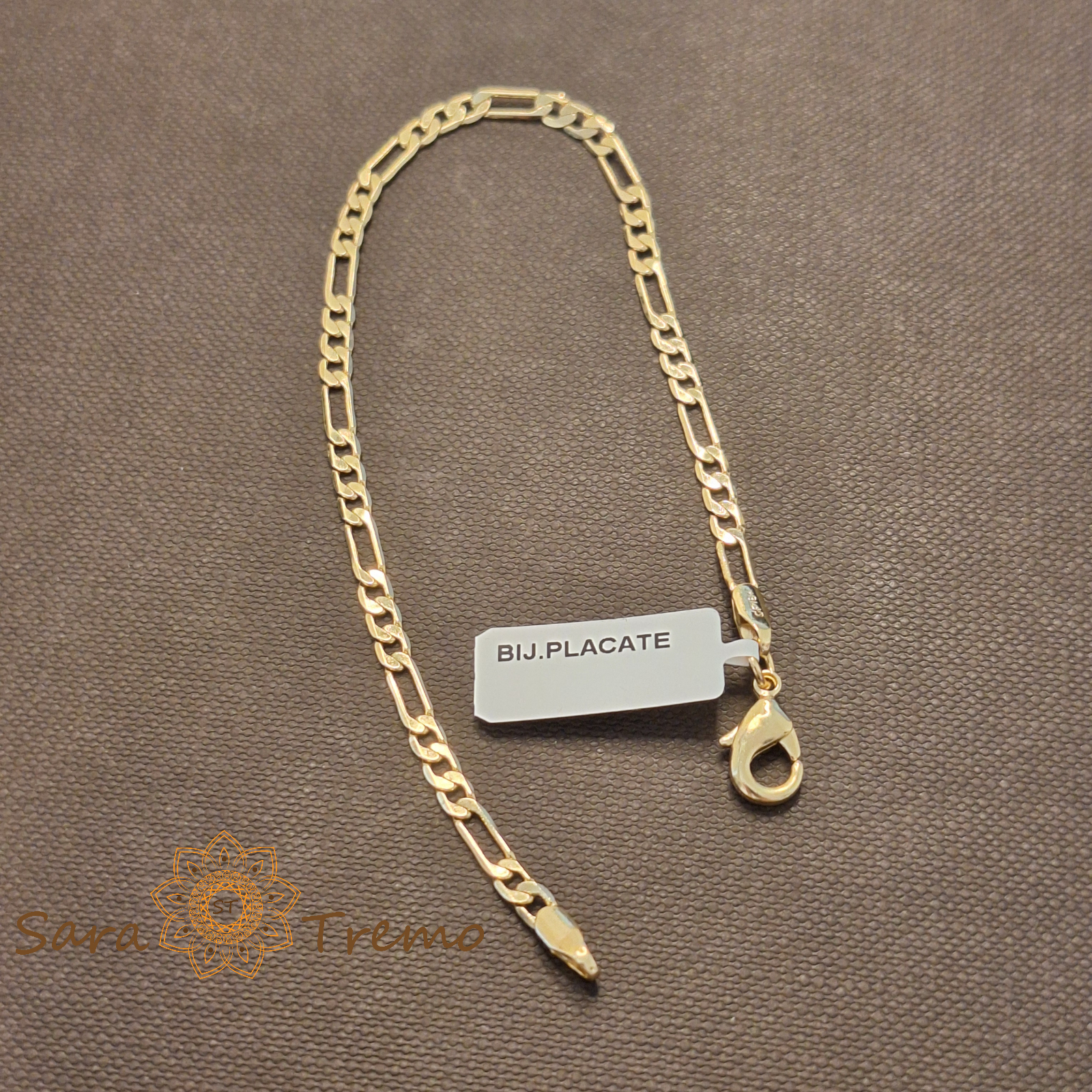 Brățara Figaro este un clasic atemporal, preferat de generații întregi. Placată cu 3 straturi groase de aur 18K, lucrată în Brazilia și marcată cu ștanța de autenticitate, oferă aceeași nuanță caldă și luminoasă ca aurul masiv, la un preț accesibil.