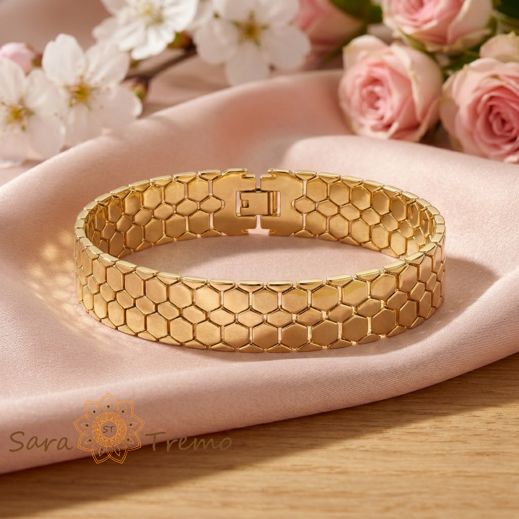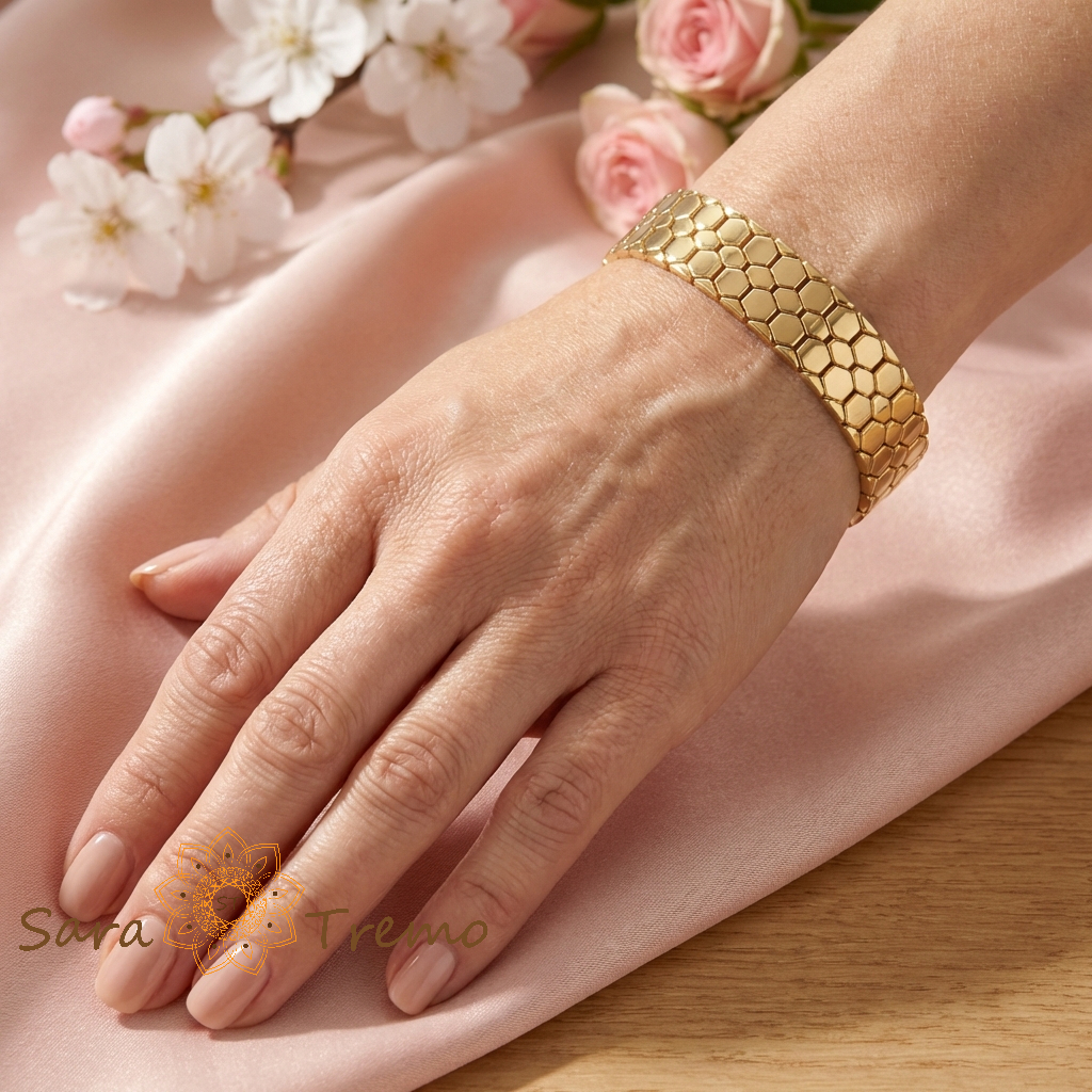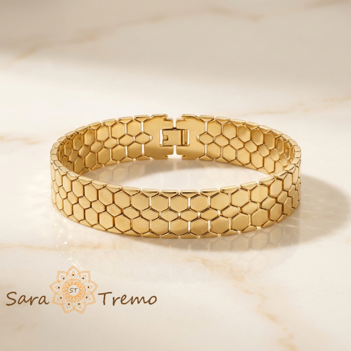 Designul tip fagure creeaza un joc subtil de lumina pe fiecare segment, oferind senzatia unei bijuterii de lux, similara pieselor din aur masiv purtate la evenimente exclusiviste. Este o bratara pentru femeia sigura pe ea, care apreciaza stilul puternic si detaliile arhitecturale in bijuterii.