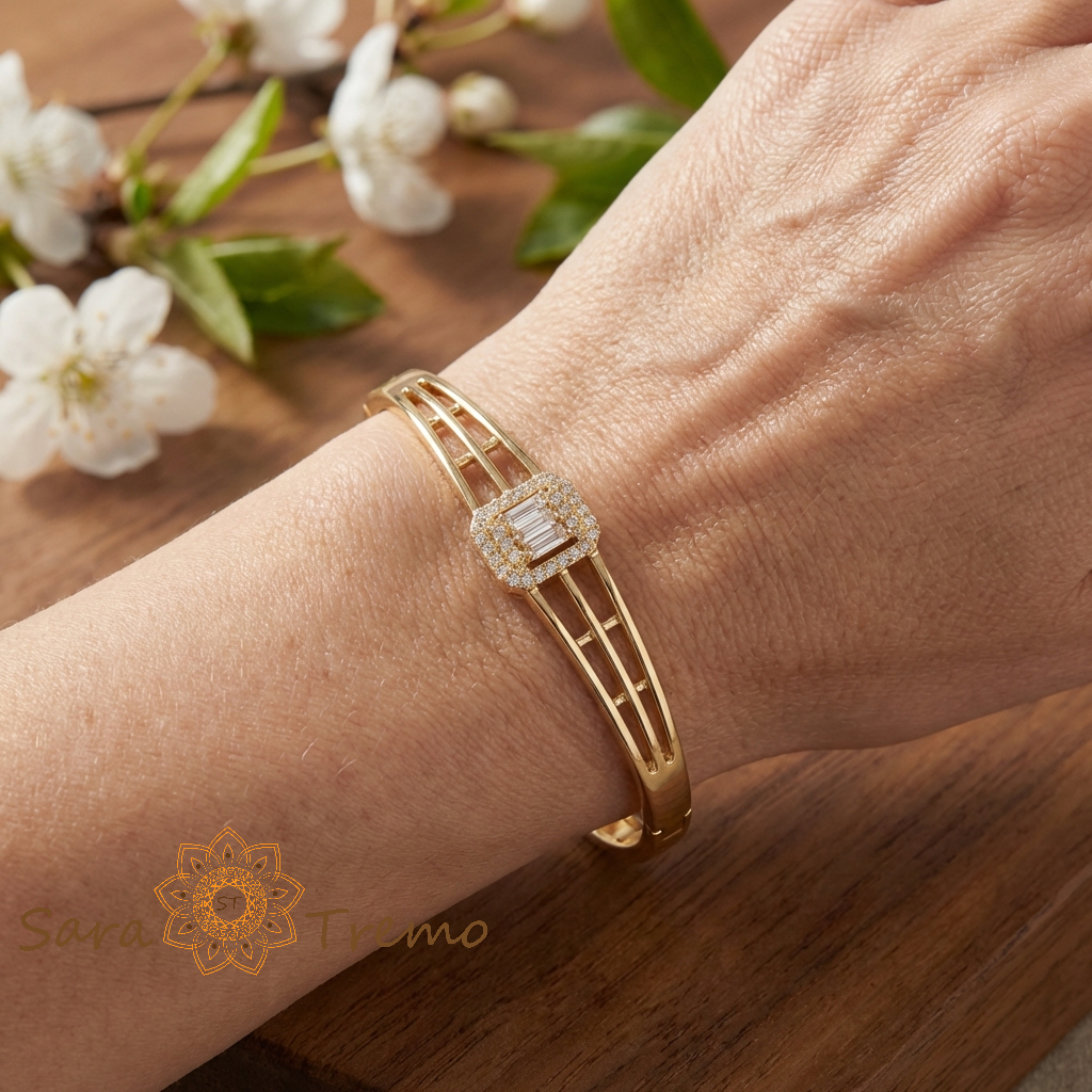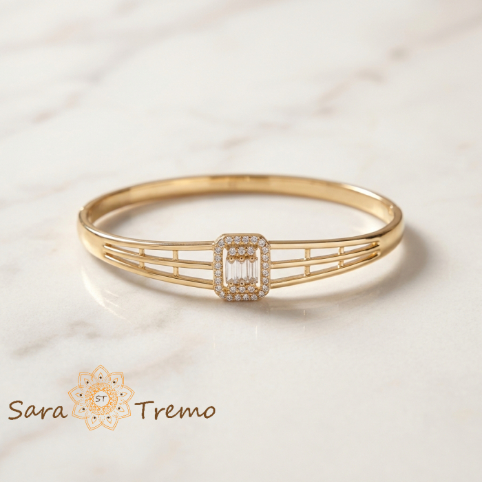 Placata cu 3 straturi de aur de 14 karate, bratara are o stralucire calda, identica aurului masiv. Modelul este fix, rigid, cu diametru interior de 6 cm si sistem de deschidere rezistent si fiabil cu balama, oferind siguranta si confort la purtare. Inchiderea este stabila si usor de utilizat, adaptata pentru utilizare zilnica sau ocazii speciale.