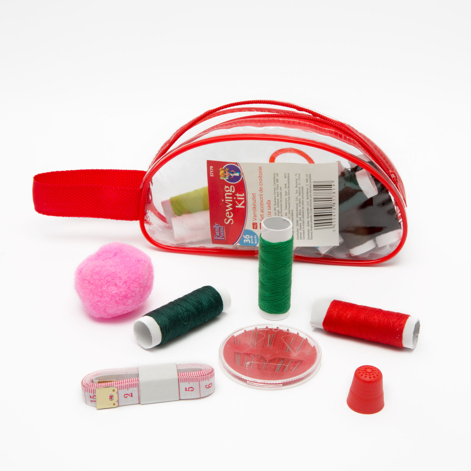 Kit de cusut multipart complet. Acesta poate fi un suport util pentru casa ta. 12 culori cu aţă, foarfece de călătorie, 10 ace de siguranţă (2,5 cm), 60 cm bandă de măsurare, 10 ace de cusut, 4 accesorii cu buton alb, degetar din plastic pentru a preveni accidentele şi tampoane cu ace roz într-o pungă de fermoar. Set complet cu sac de transport Ață de 12 culori 10 ace de diferite dimensiuni cu pernă ac Foarfece de călătorie, degetare, ace de siguranță Cu bandă de măsurare și sac de transport roș