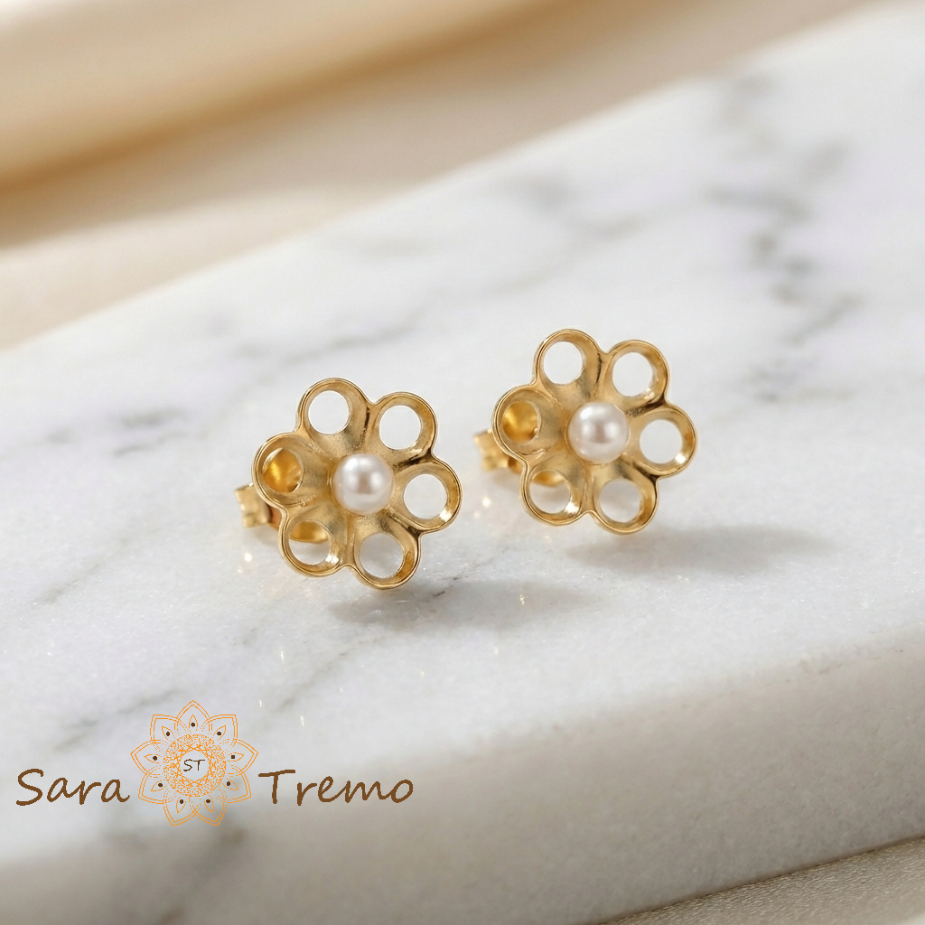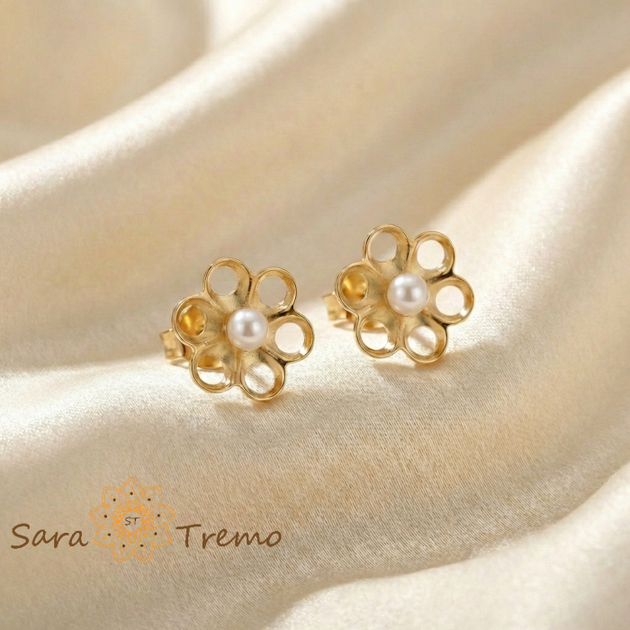 SaraTremo Cercei Floarea Aurorei – Cercei cu tija placati 18K Brazilia, perla eco