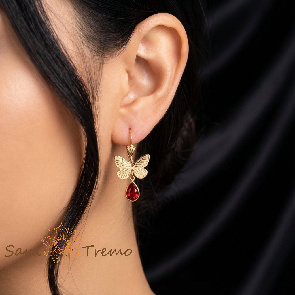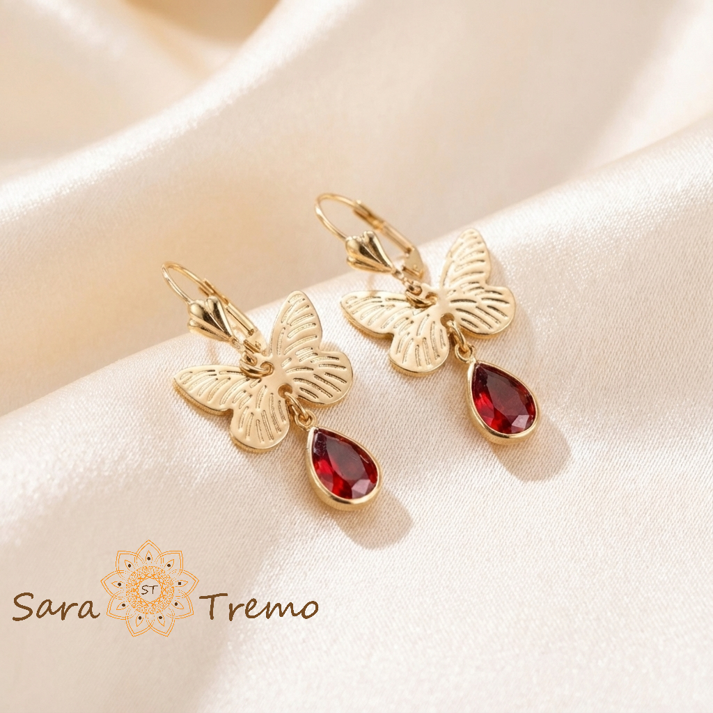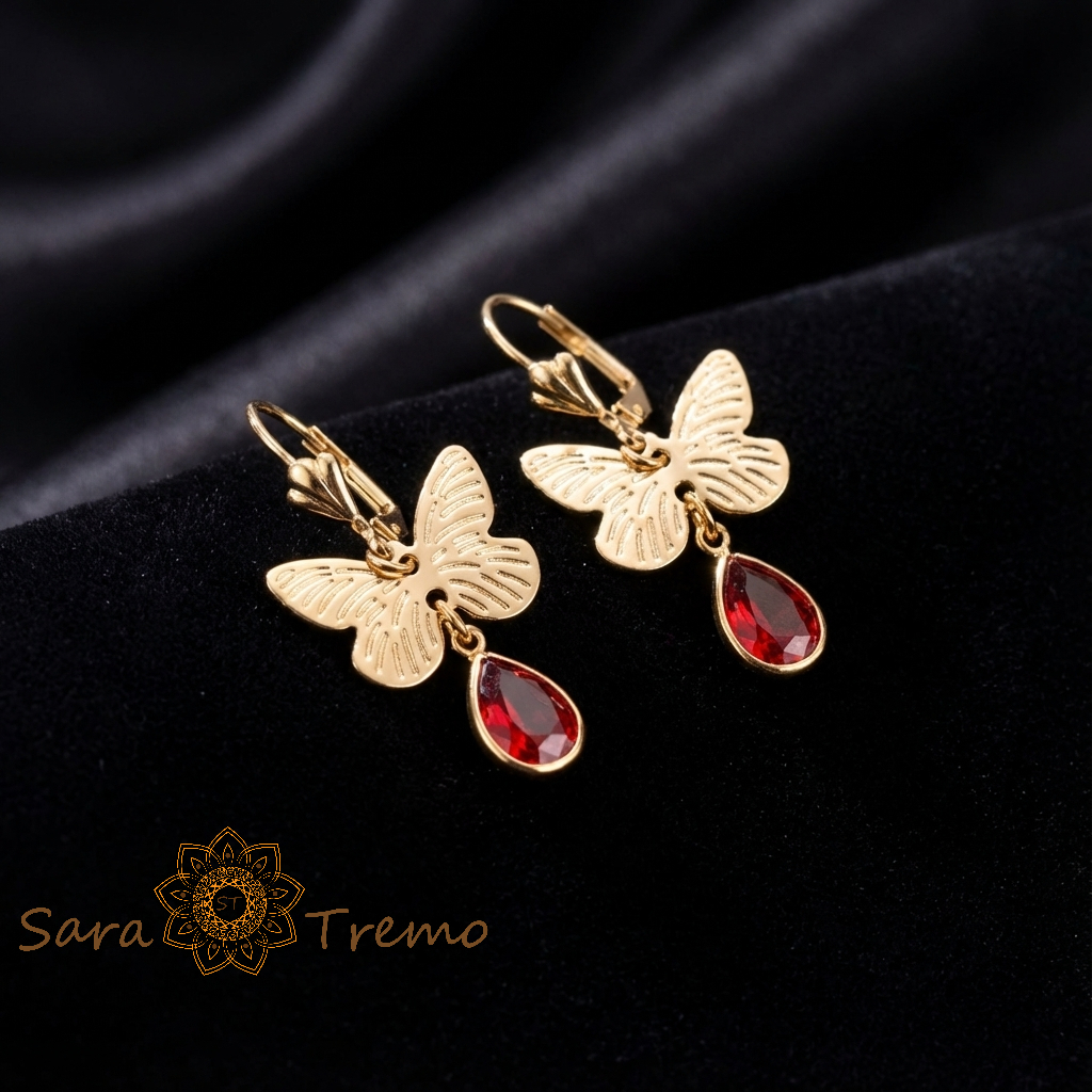 Fluturele Pasiunii sunt cerceii care aduc imediat o stare: feminitate, curaj, un pic de “drama” buna. Fluturele auriu este fin lucrat, cu linii delicate pe aripi, iar picatura rosie prinde lumina exact cat trebuie ca sa fie observata din prima.