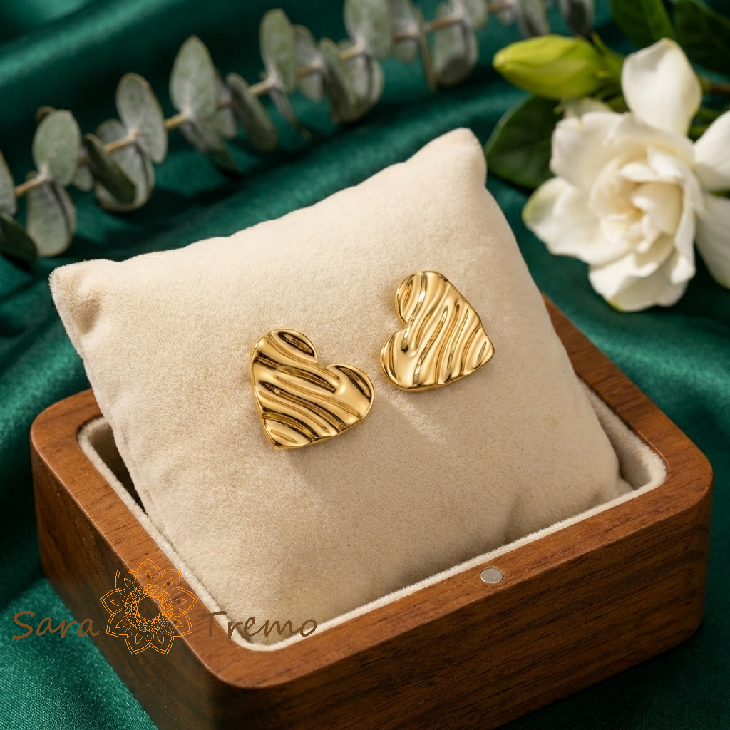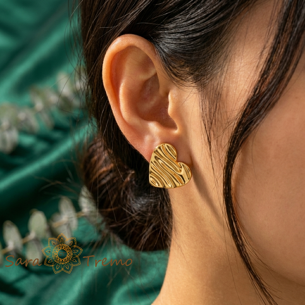 Cerceii Inima de Aur sunt mici, dar spun mult. Au forma unei inimioare elegante, cu o textură fină, tip „valuri”, care prinde lumina într-un mod special. Nu sunt cercei simpli, netezi — ci au acel relief discret care îi face să arate scump și atent lucrați, chiar și de la distanță.