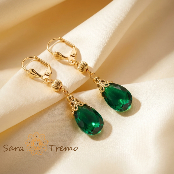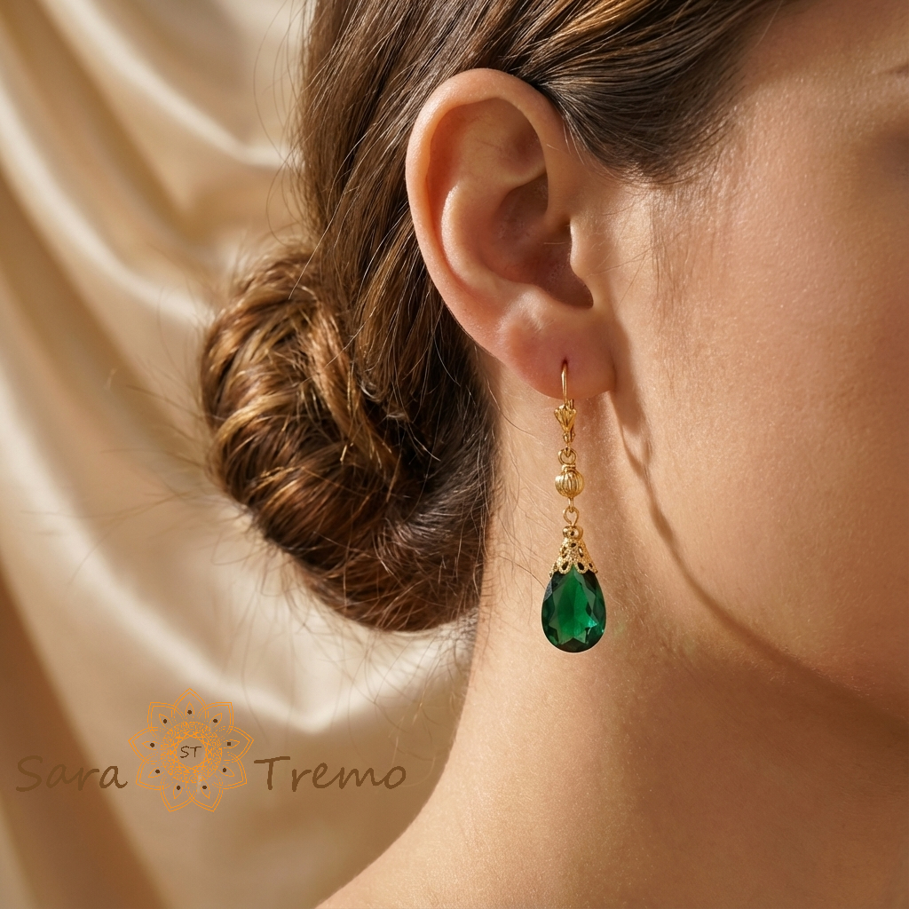 Lacrima Smaraldului sunt cerceii care schimba instant o tinuta simpla. Picatura verde are profunzime si lumina, exact ca o piatra pretioasa, iar forma alungita de 5 cm pune in valoare linia gatului si contureaza fata cu un aer regal, bine asezat.
