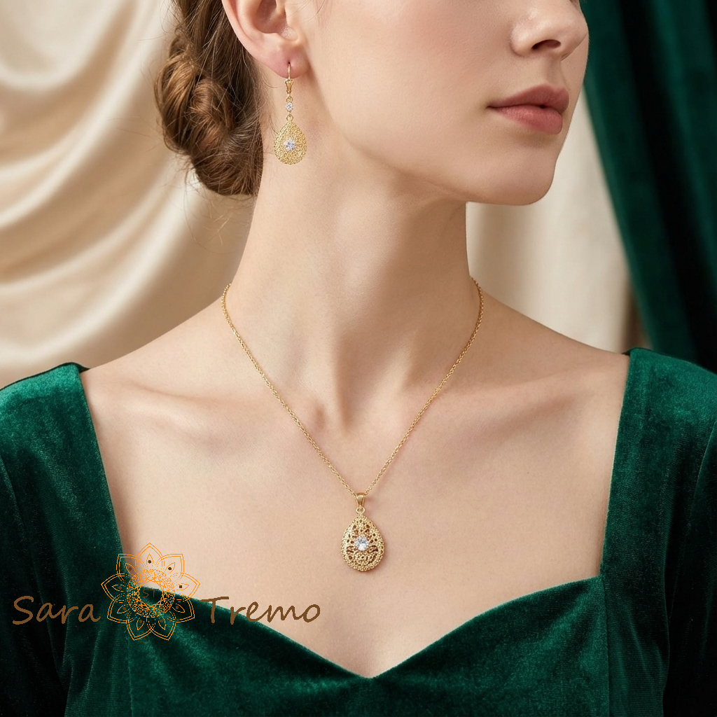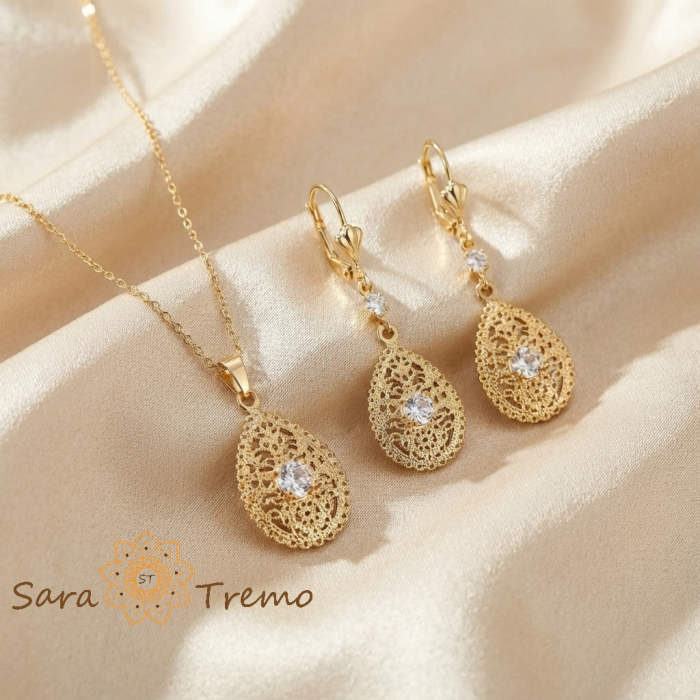 Sunt seturi care completeaza o tinuta. Si sunt seturi care o transforma. Dantela Luminii are acel efect rar: te pune in valoare din prima, fara sa incarce. Filigranul in forma de picatura arata ca o dantela de aur, iar piatra clara din centru prinde lumina exact cat trebuie, cu o eleganta “asezata”.
