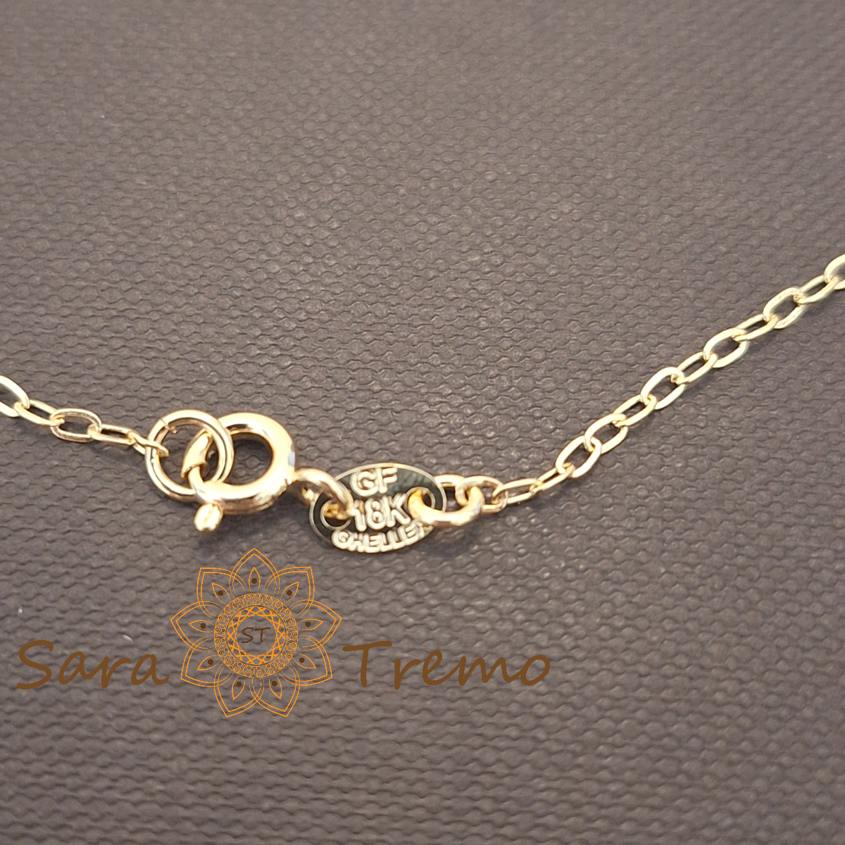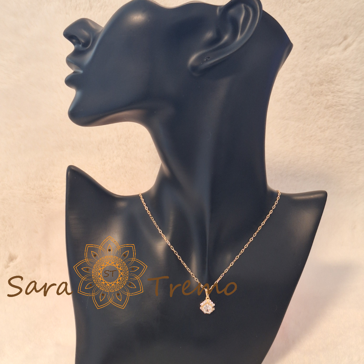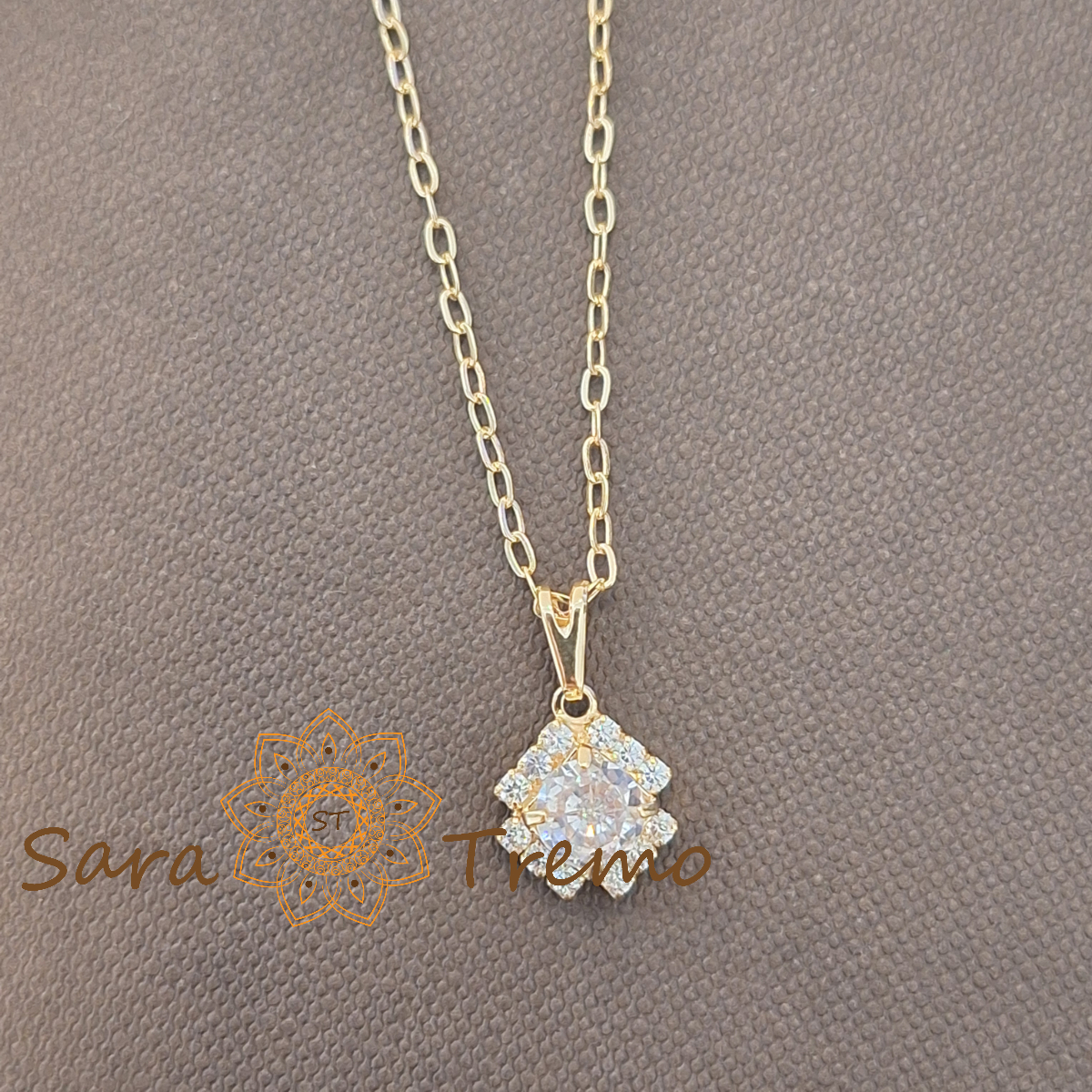 Colierul Floare de Diamant este o bijuterie delicată și rafinată, fabricată în Brazilia și marcată cu ștanță 18K pentru autenticitate. Lanțul fin de 45 cm, placat cu aur în 3 straturi groase, susține un pandantiv floral de 1 cm, decorat cu cristale zirconia albe ce imită perfect diamantele naturale.