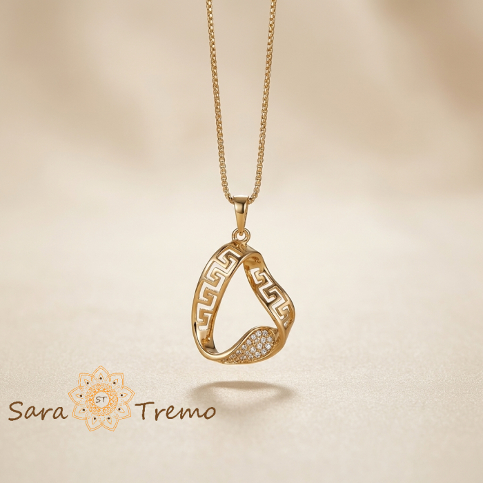 Colierul Eleganța Imperială este o bijuterie cu design sofisticat și influențe clasice. Pandantivul cu formă fluidă și detaliu geometric inspirat din motive decorative grecești transmite rafinament, echilibru și eleganță atemporală. Este o piesă statement, creată pentru femeia care apreciază bijuteriile cu personalitate și stil.