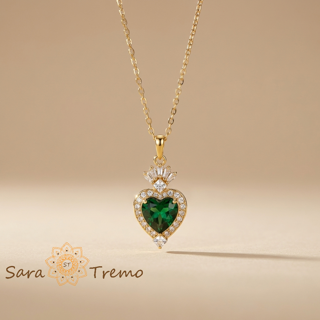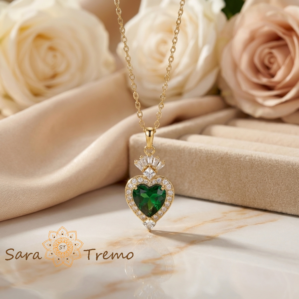 Colierul Inima Reginei este o bijuterie care atrage privirea prin designul său regal și prin strălucirea profundă a pietrei verzi. Pandantivul în formă de inimă este decorat cu un cristal verde intens, iar partea superioară amintește de o coroană delicată, oferind întregii bijuterii o eleganță demnă de bijuteriile clasice purtate de-a lungul generațiilor.