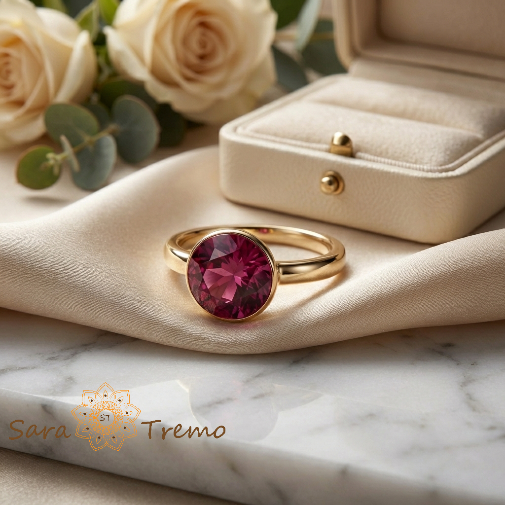 Placat cu 3 straturi de aur de 14 karate, inelul are o stralucire calda, identica aurului masiv, oferind un contrast elegant cu profunzimea pietrei rosii. Montura tip bezel incadreaza perfect zirconia, oferind stabilitate si un aspect curat, modern si rafinat. Designul este simplu, dar cu impact puternic.