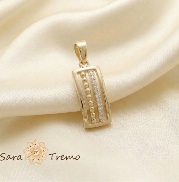 Placați 14K, păstrează acel ton cald, luminos, identic vizual cu aurul masiv. În centru, ai două accente care dau personalitate: un șir de biluțe în relief (efect sofisticat, „bijuterie lucrată”) și o bandă cu cristale zirconia care prinde lumina elegant. Zirconia imită perfect strălucirea diamantelor, astfel încât pandantivul arată ca o piesă premium, potrivită atât pentru zi, cât și pentru seară.