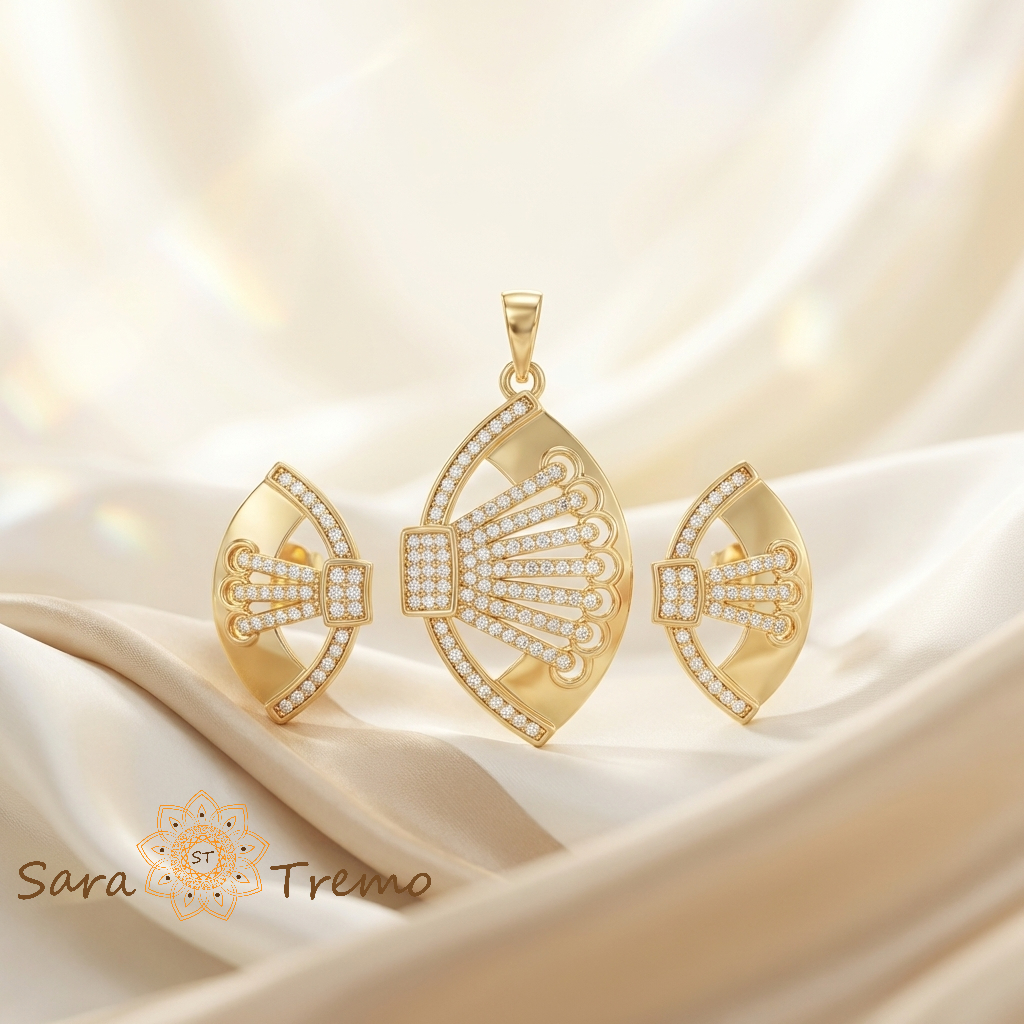 Setul Evantaiul Regal este o bijuterie eleganta inspirata din rafinamentul accesoriilor clasice. Designul sau in forma de evantai simbolizeaza gratie, feminitate si stil, fiind alegerea perfecta pentru femeile care apreciaza detaliile fine si bijuteriile cu personalitate.
